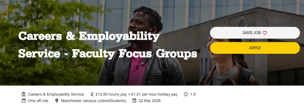 Friend of STRIVE – Sheri Lawal is looking for students to take part some focus group sessions for our Careers and Employability service- The advert for this PAID opportunity can be found here – Careers & Employability Service – Faculty Focus Groups in Manchester campus (Jobs4Students) – Manch…